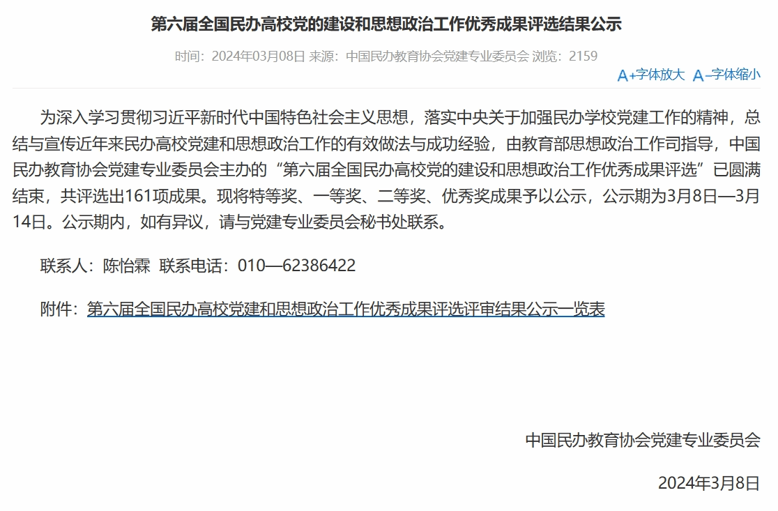 新闻网讯(通讯员胡劲生)近日,由教育部思想政治工作司规划和指导、中国民办教育协会主办的“全国民办高校党的建设和思想政治工作优秀成果评选”揭晓。由体育人文与健康系党总支书记、主任郭远兵和党总支副书记胡劲生申报的《“四航”工程为心理困难学生构建心理健康社区》获“第六届全国民办高校党的建设和思想政治工作优秀成果奖”优秀奖。