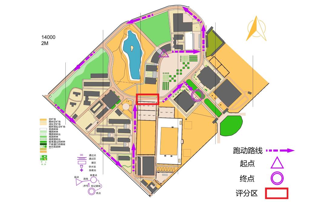 2、校园定向赛:每支参赛队10男10女,每名运动员必须佩戴号码布。本次比赛采用定向越野按序打卡形式完成比赛,起点用三角形△表示,终点用双圆圈◎表示,打卡地点在图中用单圆圈○表示。运动员出发时打完起点后拿取地图,按照地图上单圆圈所示的顺序打完相应点签,按序打完所有点后打完终点◎完成比赛。完成比赛后在终点区域(教学楼A栋)成绩统计处录取指卡信息获取成绩条。完赛时间短者名次靠前,名次即为录取团队积分的分值。