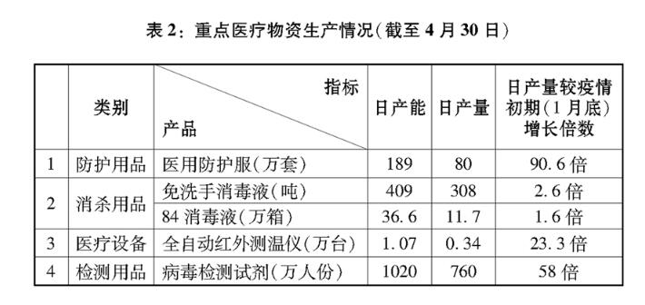 大力加强医疗物资生产供应和医疗支持服务。疫情防控阻击战,也是后勤保障战。疫情初期,武汉市医疗防护物资极度短缺,为了节省防护用品、争分夺秒抢救病患,一线医护人员克服困难,最大限度地延长防护用品使用时间。为尽快解决医疗资源短缺和病患急剧增多的突出矛盾,中国充分发挥制造业门类全、韧性强和产业链完整配套的优势,克服春节假期停工减产等不利因素,开足马力,深挖潜力,全力保障上下游原料供应和物流运输,保证疫情防控物资的大规模生产与配送。医疗企业克服工人返岗不足等困难,以最快速度恢复医疗用品生产,最大限度扩大产能。其他行业企业迅速调整转产,生产口罩、防护服、消毒液、测温仪等防疫物资,有效扩大了疫情防控物资的生产供应。快速启动防控医疗物资应急审批程序,全面加强质量安全监管,确保以最快的速度批准上市、促产保供,截至5月31日,共应急批准17个药物和疫苗的19件临床试验申请,附条件批准2个疫情防控用药上市。在各方共同努力下,医用物资产能不断提升,医用物资保供实现从“紧缺”到“紧平衡”“动态平衡”“动态足额供应”的跨越式提升(表2)。2月初,医用非N95口罩、医用N95口罩日产量分别为586万只、13万只,到4月底分别超过2亿只、500万只。畅通供应链条和物流渠道,建立联保联供协作机制,源源不断地把全国支援物资运送到疫情防控重点地区。
