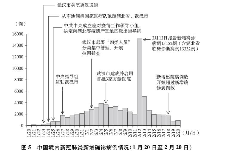 全国新增确诊病例快速增加,防控形势异常严峻。中国采取阻断病毒传播的关键一招,坚决果断关闭离汉离鄂通道,武汉保卫战、湖北保卫战全面打响。中共中央成立应对疫情工作领导小组,并向湖北等疫情严重地区派出中央指导组。国务院先后建立联防联控机制、复工复产推进工作机制。全国集中资源和力量驰援湖北省和武汉市。各地启动重大突发公共卫生事件应急响应。最全面最严格最彻底的全国疫情防控正式展开,疫情蔓延势头初步遏制。(图5)