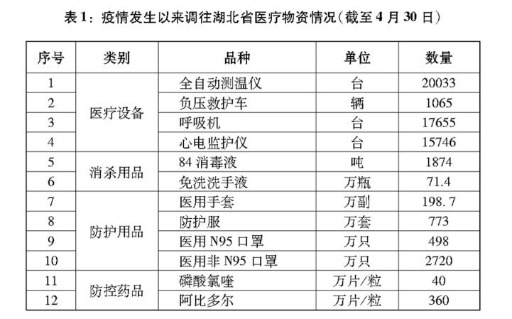 开展新中国成立以来规模最大的医疗支援行动。调动全国医疗资源和力量,全力支持湖北省和武汉市医疗救治。自1月24日除夕至3月8日,全国共调集346支国家医疗队、4.26万名医务人员、900多名公共卫生人员驰援湖北。19个省份以对口支援、以省包市的方式支援湖北省除武汉市以外16个地市,各省在发生疫情、防控救治任务十分繁重的情况下,集中优质医疗资源支援湖北省和武汉市。人民解放军派出4000多名医务人员支援湖北,承担火神山医院等3家医疗机构的医疗救治任务,空军出动运输机紧急运送医疗物资。各医疗队从接受指令到组建2小时内完成,24小时内抵达,并自带7天防护物资,抵达后迅速开展救治。在全国紧急调配全自动测温仪、负压救护车、呼吸机、心电监护仪等重点医疗物资支援湖北省和武汉市(表1)。从全国调集4万名建设者和几千台机械设备,仅用10天建成有1000张病床的火神山医院,仅用12天建成有1600张病床的雷神山医院。短短10多天建成16座方舱医院,共有1.4万余张床位。加强临床血液供应,10个省份无偿支援湖北省红细胞4.5万单位,血小板1762个治疗量,新鲜冰冻血浆137万毫升(不含恢复期血浆)。大规模、强有力的医疗支援行动,有力保障了湖北省和武汉市救治,极大缓解了重灾区医疗资源严重不足的压力。