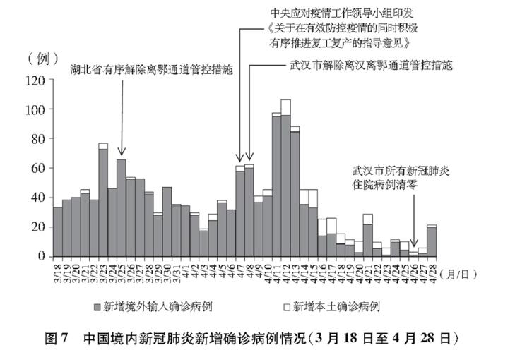 境内疫情总体呈零星散发状态,局部地区出现散发病例引起的聚集性疫情,境外输入病例基本得到控制,疫情积极向好态势持续巩固,全国疫情防控进入常态化。加大力度推进复工复产复学,常态化防控措施经受“五一”假期考验。经中共中央批准,国务院联防联控机制派出联络组,继续加强湖北省疫情防控。(图8)