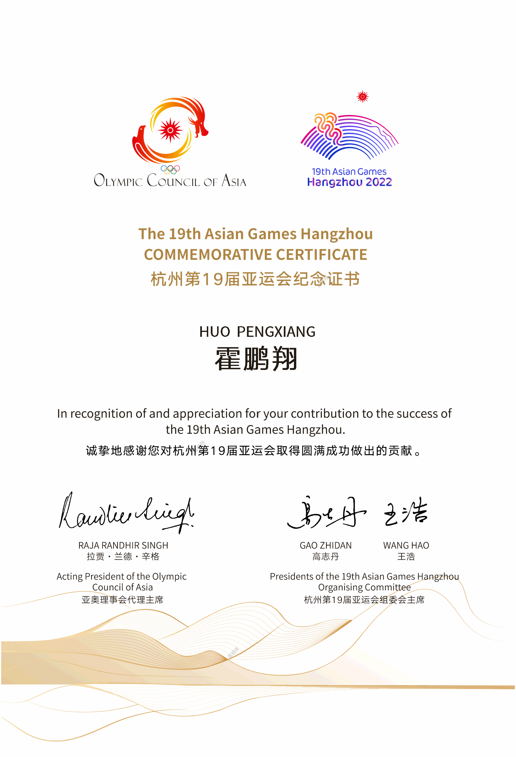 今年3月,霍鹏翔受杭州第19届亚运会组委会邀请,技术支持亚运会拳击项目。体育教育训练系高度重视和大力支持霍鹏翔在亚组委的执裁工作。在正式比赛期间,霍鹏翔以饱满的激情和强烈的责任感,凭借过硬的专业技能,高质量完成各项工作,受到亚组委的高度评价,期间曾接受CCTV5采访。访问链接https://app.cctv.com/special/m/livevod/index.html?guid=49276c2dbb1d47c7bbb488c6efaf4dbd&vtype=2&vsetId=C10395。