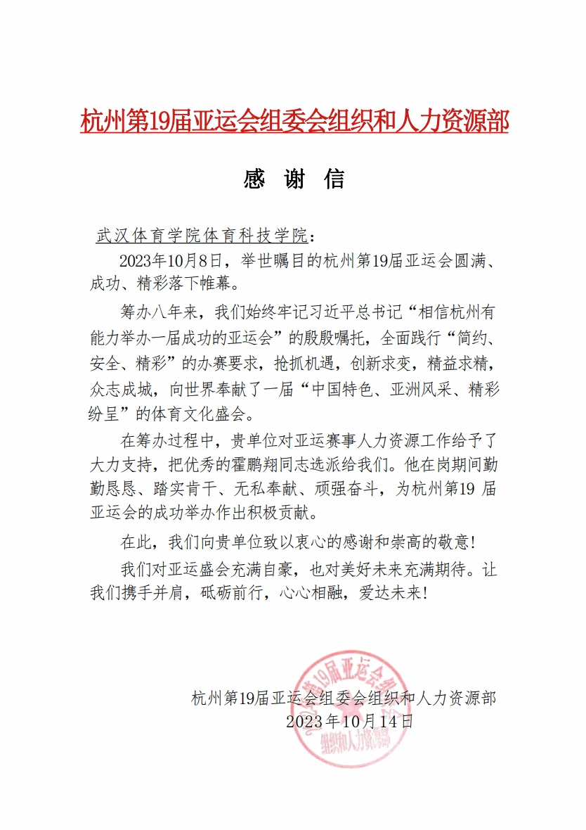新闻网讯(通讯员李丹)近日,杭州第19届亚运会组委会给我校发来感谢信,对我校给予亚运赛事人力资源工作的大力支持表示感谢,对霍鹏翔在亚运会期间承担拳击项目相关技术服务工作的出色表现给予高度认可和赞赏。