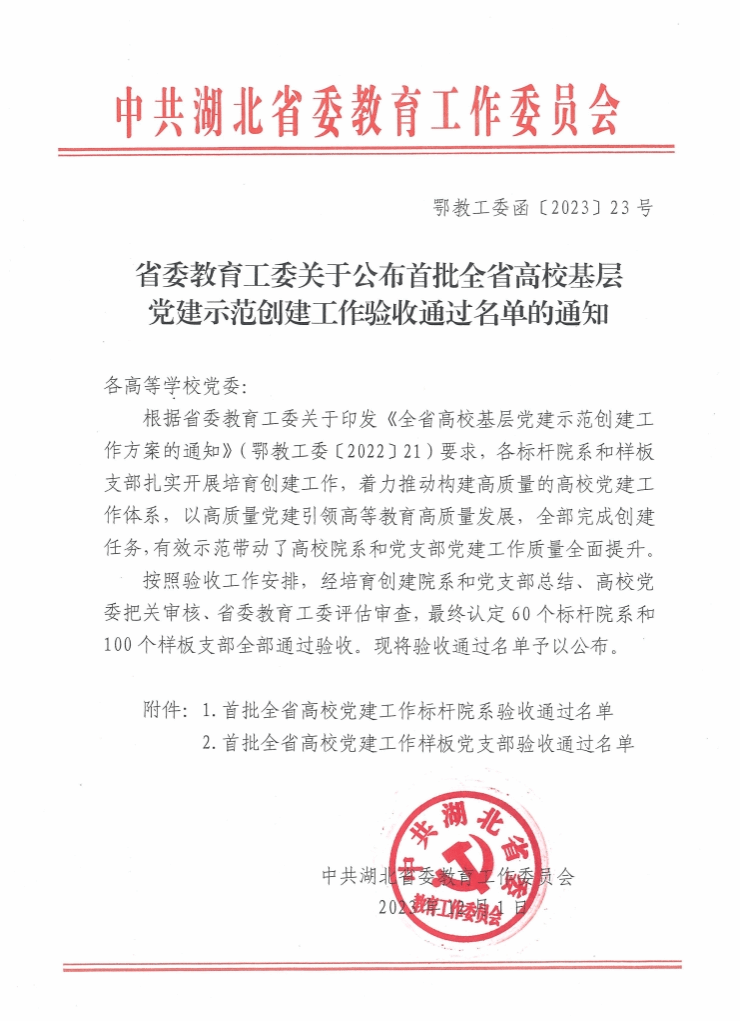 新闻网讯(通讯员:陈贞旭)近日,根据湖北省委教育工委所公布“首批全省高校党建工作样板党支部”建设单位培育验收通过名单,我院艺术与传媒系新闻教研室党支部顺利通过验收。