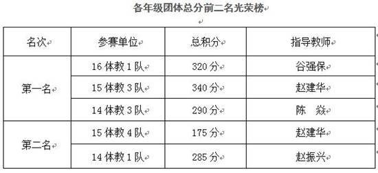 本届比赛团体总分冠、亚、季军分别由15体教3队、16体教1队和14体教3队获得。比赛不仅展示了体育教育本科专业学生的实践教学能力,还巩固了他们的基本技术与技能,为以后的教师资格证考试、实习和就业打下了坚实的基础。