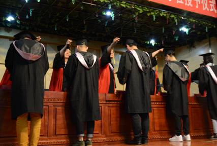 在热烈的掌声中,六位老师为2017届全体本科毕业生拨动学士帽的流苏,并授予学士学位证书。流苏从右侧到左侧的移动象征着同学们完成了从学生到学士的转变。