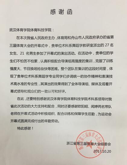 近日,浙江省第三届体育大会组委会给我院发来感谢信,感谢我院术科系舞蹈学教研室师生对浙江省第三届体育大会开幕式的大力支持和优秀表现表示感谢。