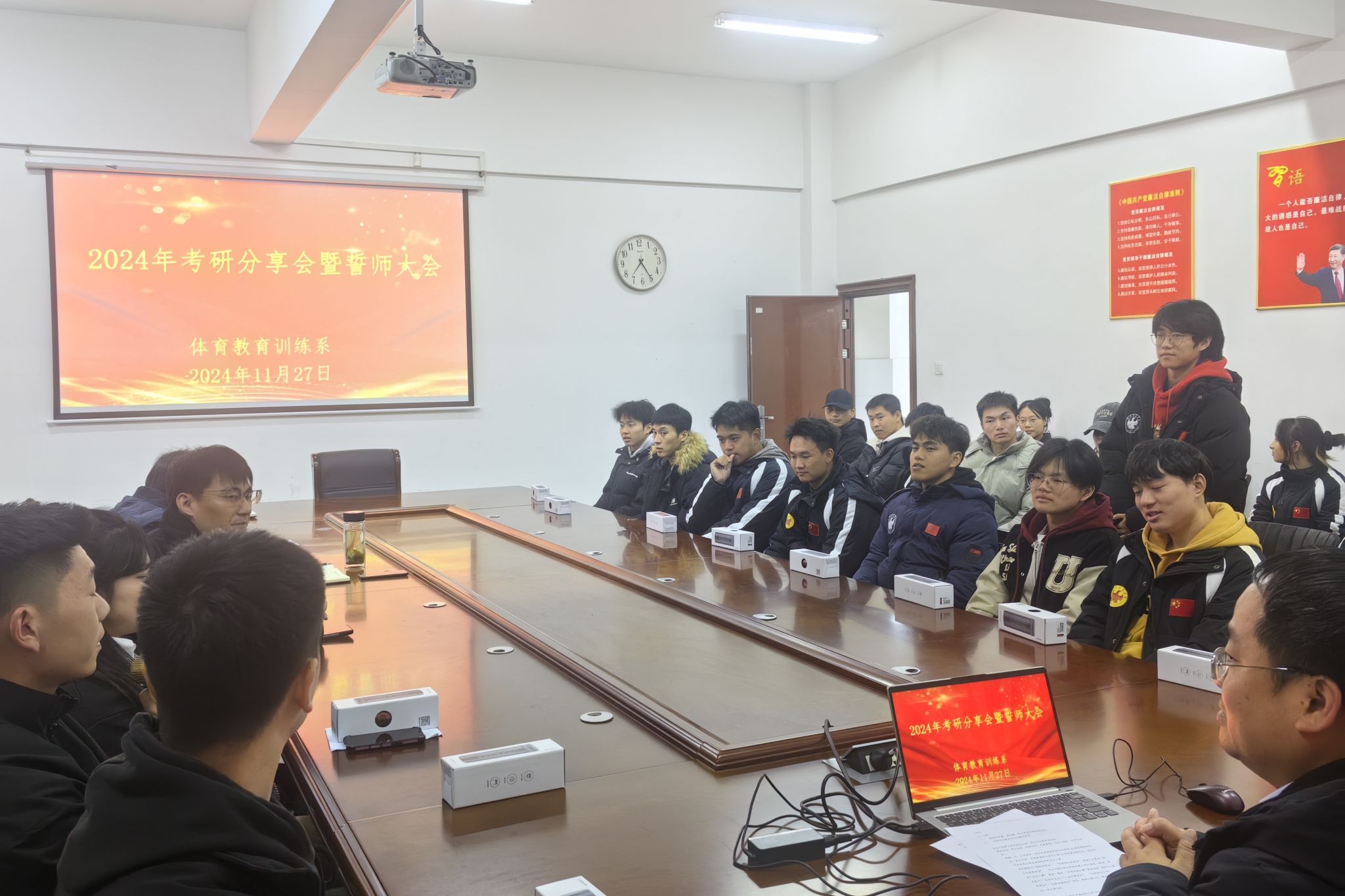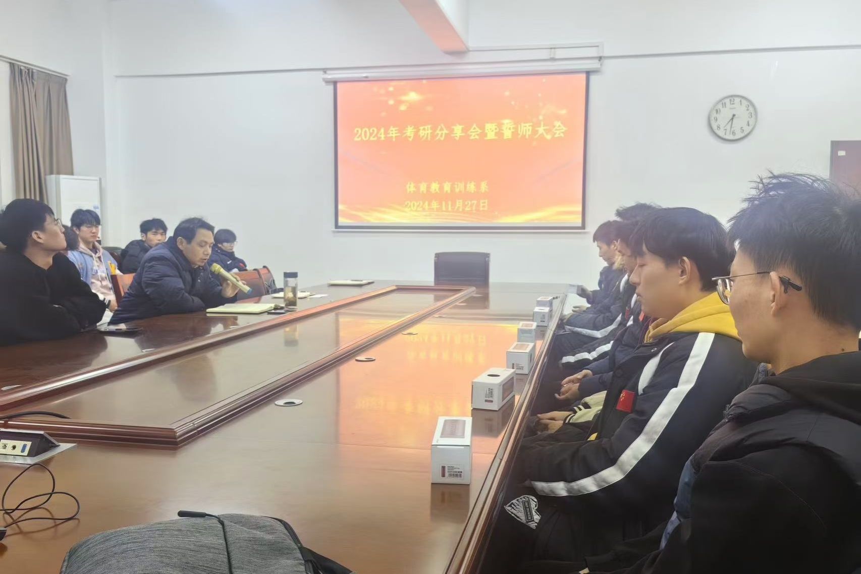 新闻网讯(通讯员喻萌)2024年11月27日,体育a教育训练系在会议室召开2025届考研分享暨誓师动员大会。体育教育训练系总支书记、主任朱雄,辅导员喻萌、李寅帆及2025届考研学生代表出席本次大会。我系2024届考研成功上岸的罗楠、姜家豪、张小亮等三位优秀毕业生受邀分享个人考研经历和成功经验,为大家答疑解惑,分享心得。大会由系党总支副书记杨辉主持。