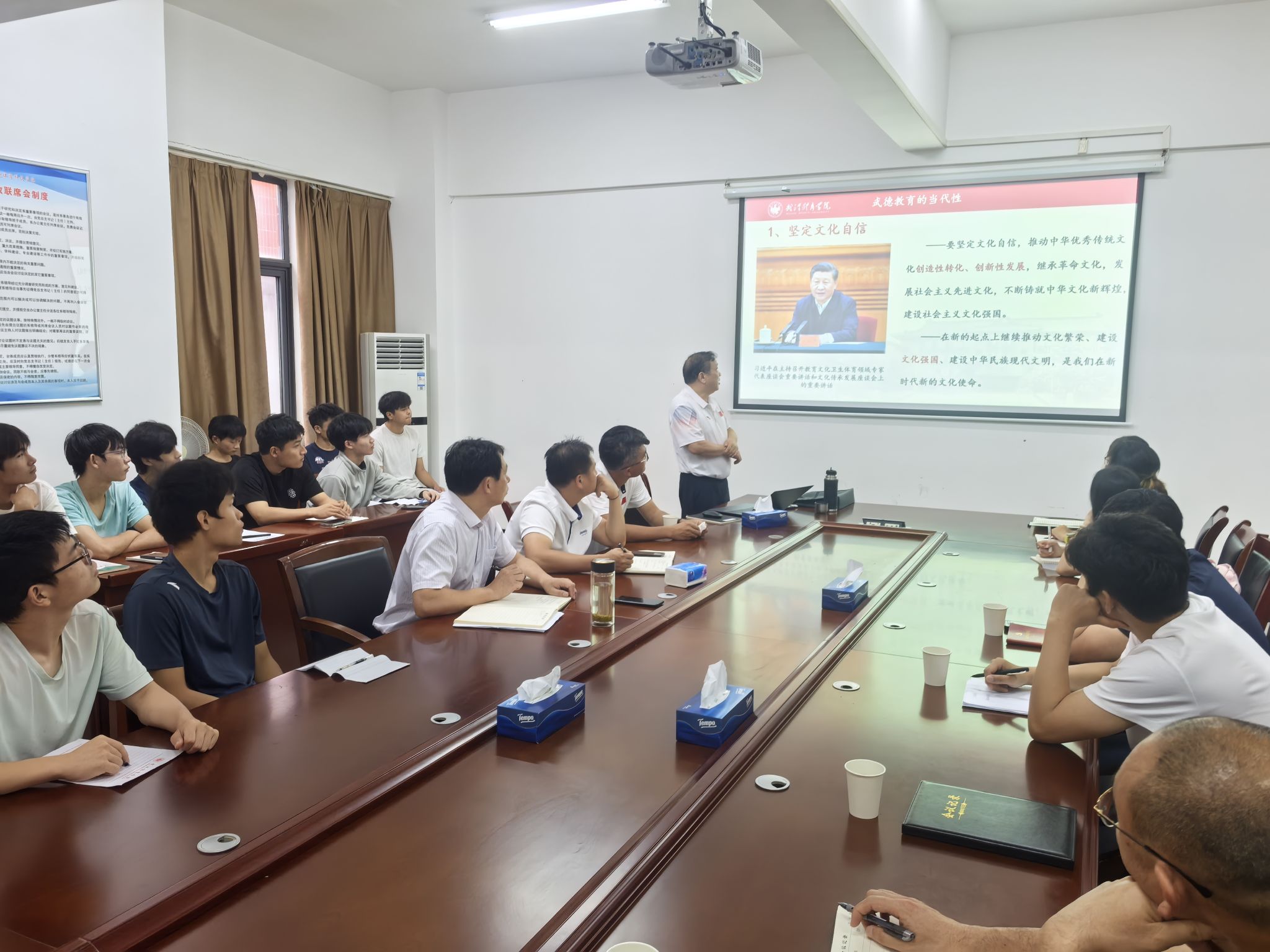 新闻网讯(通讯员唐凯)为加强重竞技教研室师生道德修养,提升民族传统体育文化自信,引导其树立正确的世界观、人生观和价值观,6月9日,体育教育训练系特邀龙行年教授为重竞技教研室师生作了题为《未曾学艺先学礼,未曾习武先明德--武德修养》专题讲座。体育教育训练系领导班子和重竞技教研室跆拳道、空手道、摔跤等专项师生参加报告会。报告由体育教育训练系党总支书记、主任朱雄主持。