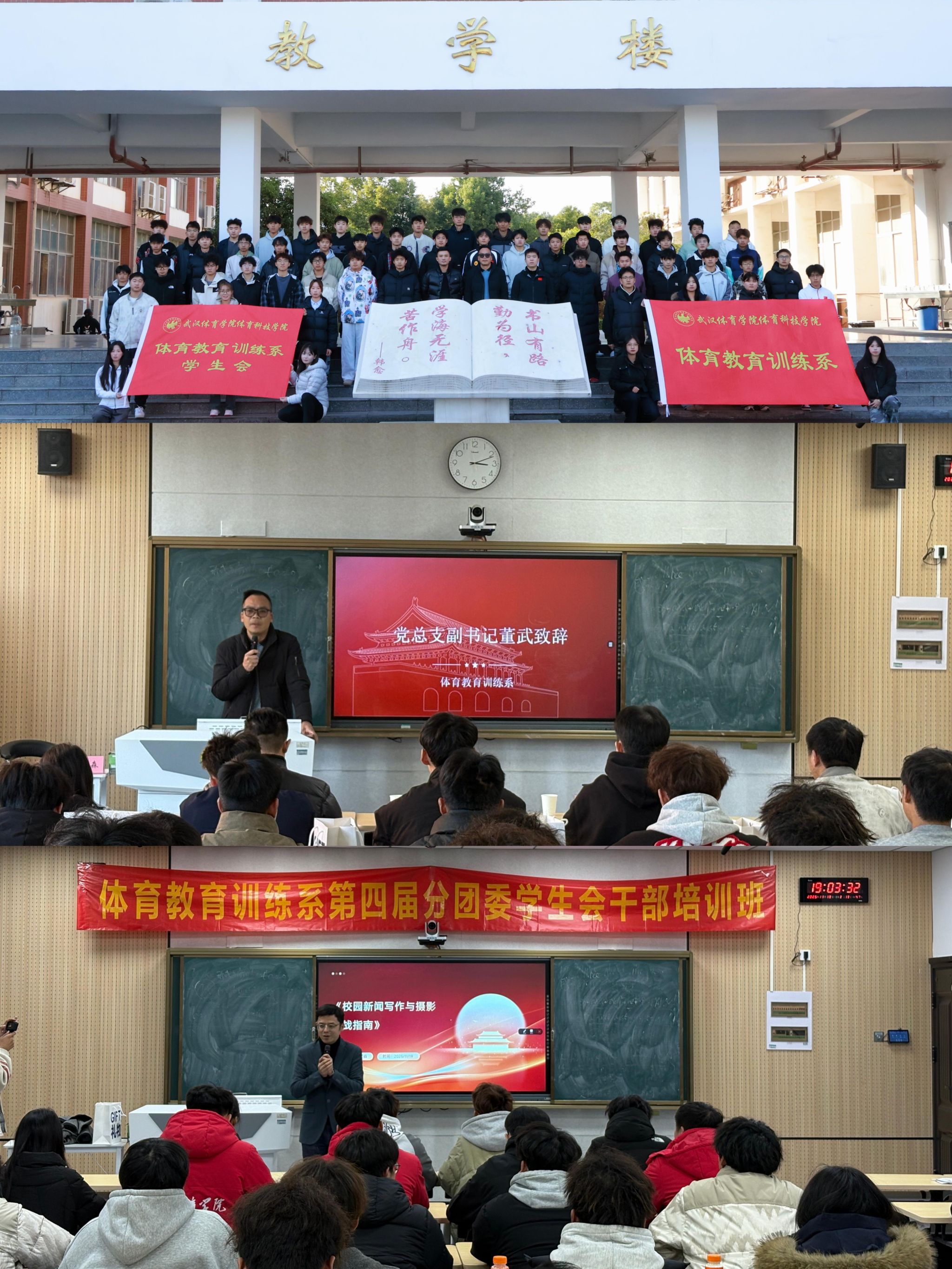 新闻网讯(通讯员 李粤雄、赵博文)11月19日14:00,体育教育训练系第四届学生会及分团委学生干部培训班开班仪式暨专题培训在教学楼BZ204教室举行。党总支副书记董武、分团委书记李粤雄、分团委副书记赵博文出席开班仪式,经换届选举产生的60余名新一届学生会及分团委学生干部参加本次培训。