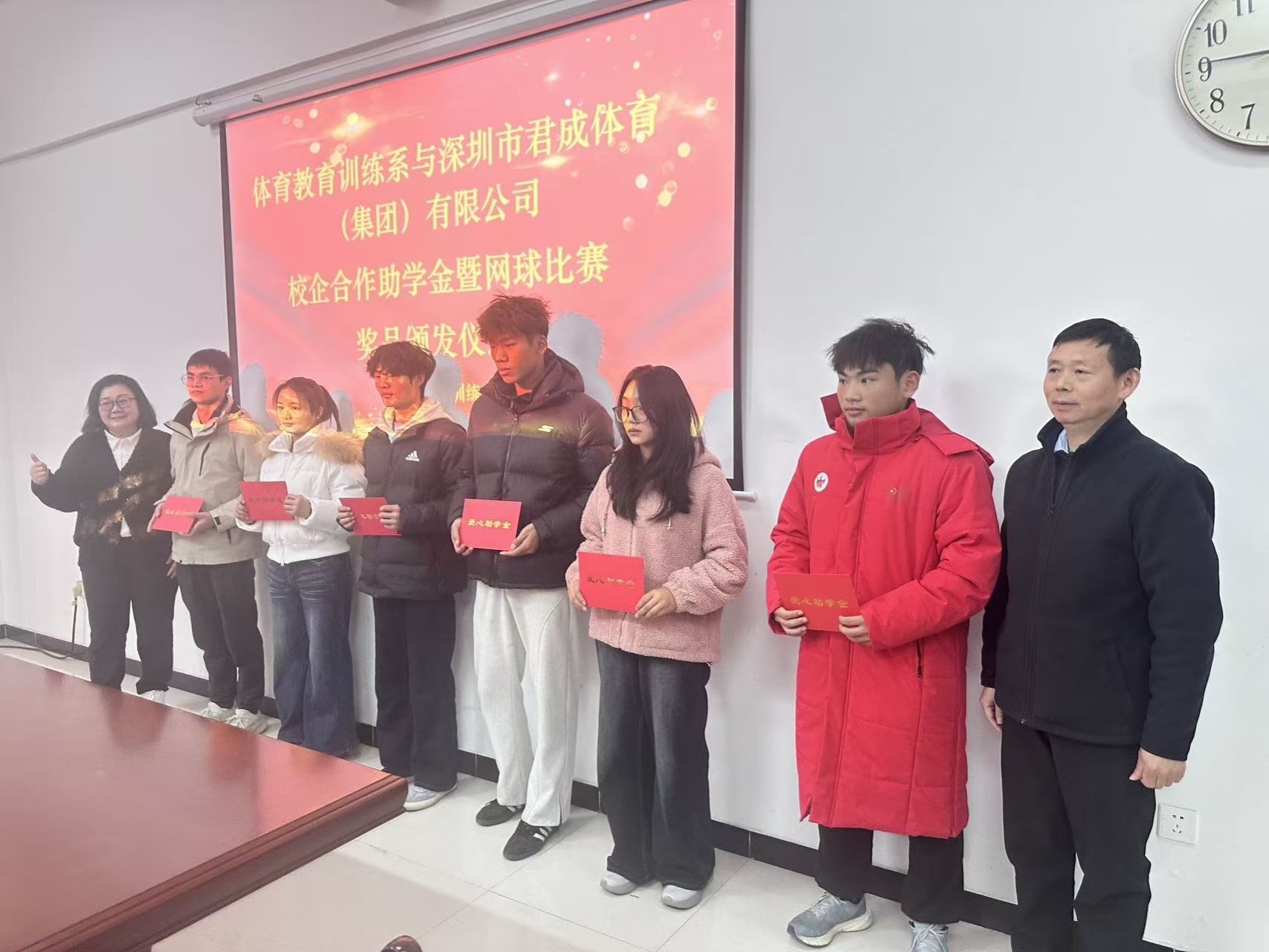 新闻网讯(通讯员许晖)12 月 16 日,体育教育训练系会议室暖意融融、掌声阵阵,“君成助学金”暨 2025 “君成体育杯” 网球联赛颁发仪式隆重举行。体育科技学院教务处处长彭李明、深圳市君成体育(集团)有限公司董事长范潇君女士及公司高管、体育教育训练系领导班子、师生代表齐聚一堂,共同见证体育教育训练系校企合作迈向新阶段。