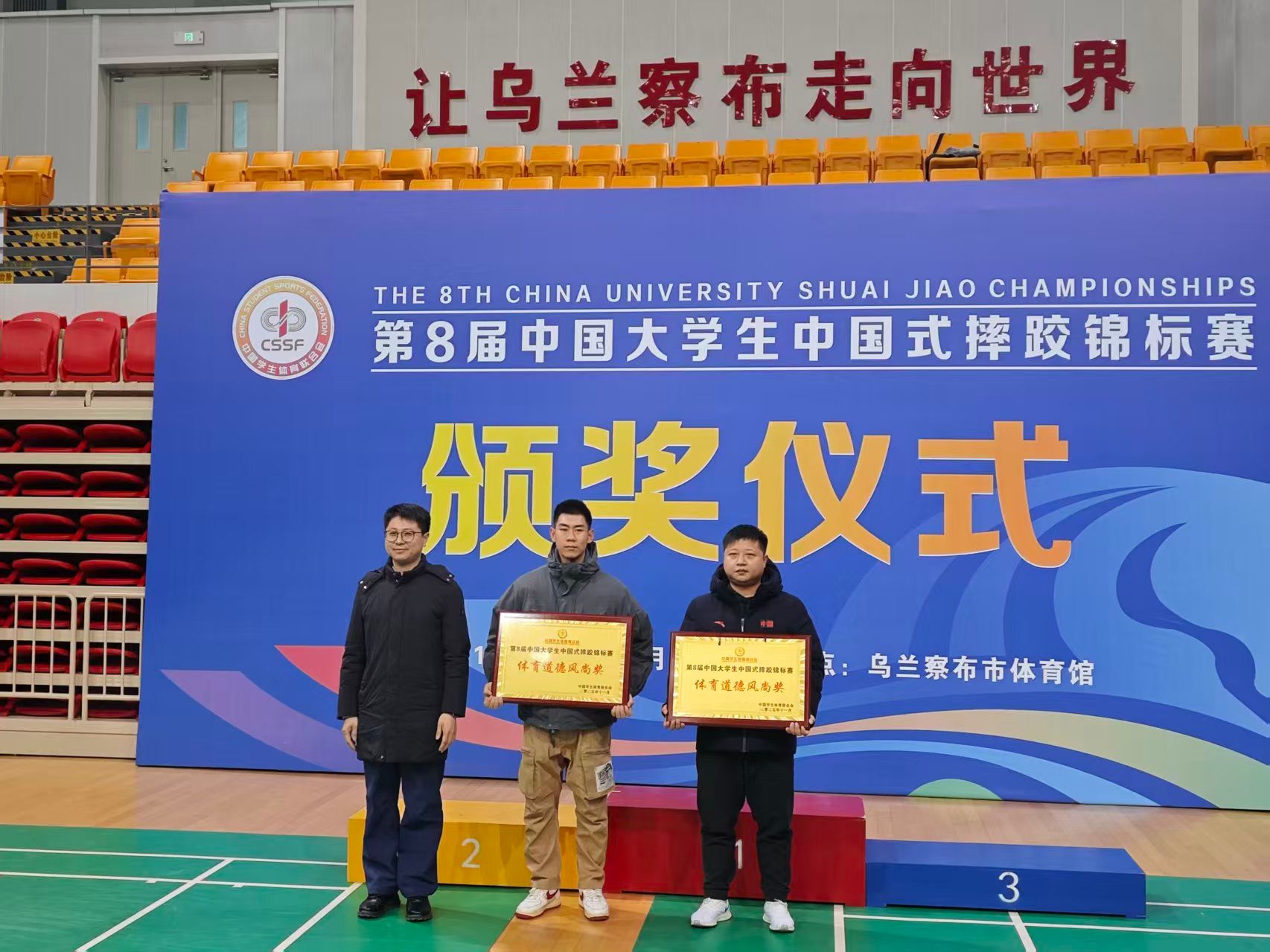 (通讯员张小龙、赵鹏)12月1日,第八届中国大学生中国式摔跤锦标赛在内蒙古乌兰察布市圆满落幕。武汉体育学院体育科技学院选派体育教育训练系与国际教育系的12名学生,联合组建代表队首次出征。队员奋勇拼搏,最终斩获5枚铜牌、5个第五名,并荣膺“体育道德风尚奖”,以优异表现夺得丙组团体总分第六名的佳绩,实现了运动成绩与精神文明双丰收。