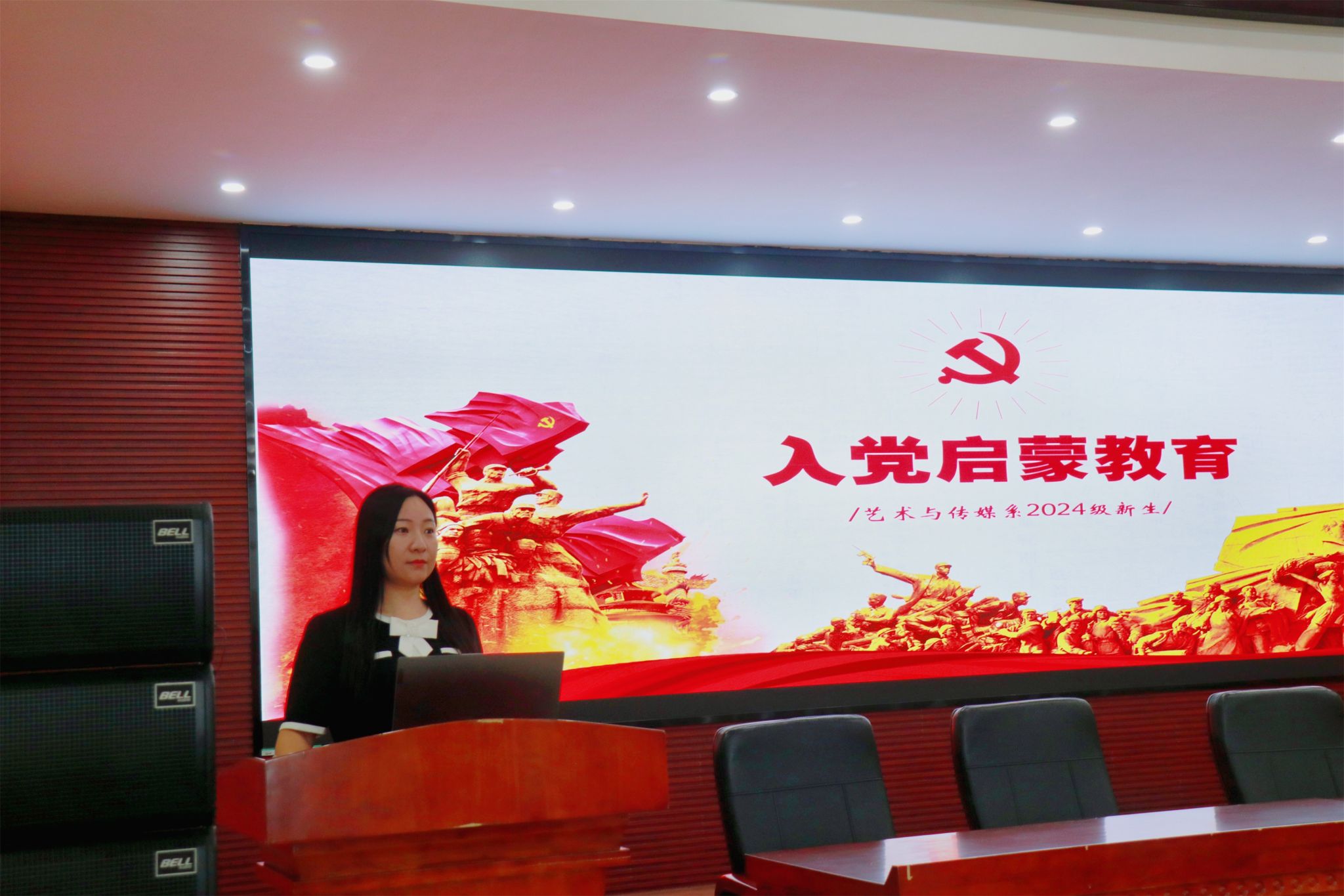 9月29日中午,艺术与传媒系党总支副书记王林蓝主持开展新生开展入党启蒙教育,为同学们诠释新时代大学生肩负的职责和使命。她围绕党的历史、党的基本知识、发展党员的基本原则、如何树立正确的入党动机等进行深入浅出地讲解。她着重介绍党员发展的具体流程,包括递交入党申请书、确定入党积极分子、列为发展对象、预备党员的接收和转正等环节。她强调,作为新时代的大学生,要深刻认识新时代党的历史使命,不断加强自身修养,提高综合素质,积极向党组织靠拢,努力成为德智体美劳全面发展的社会主义建设者和接班人。