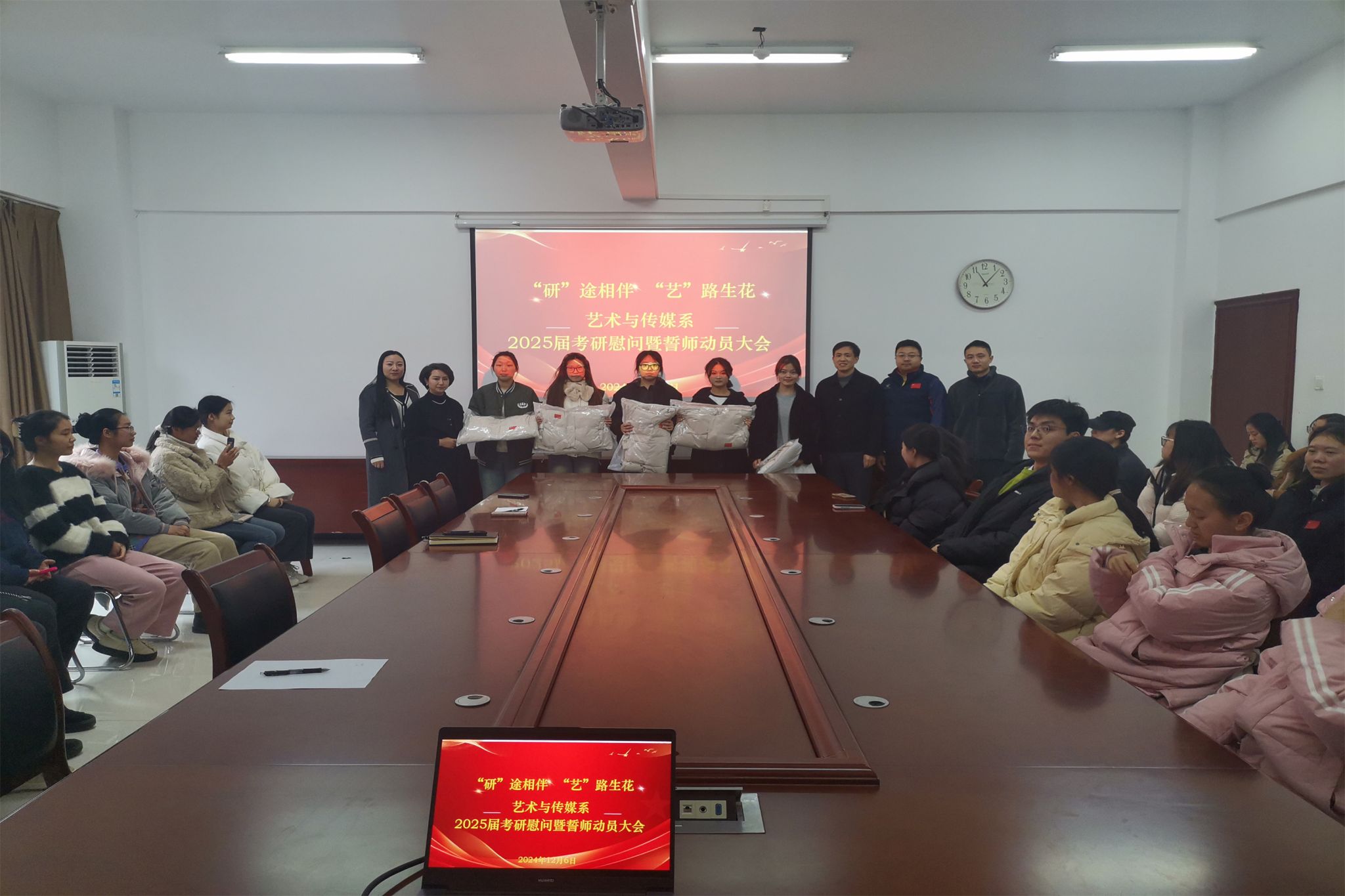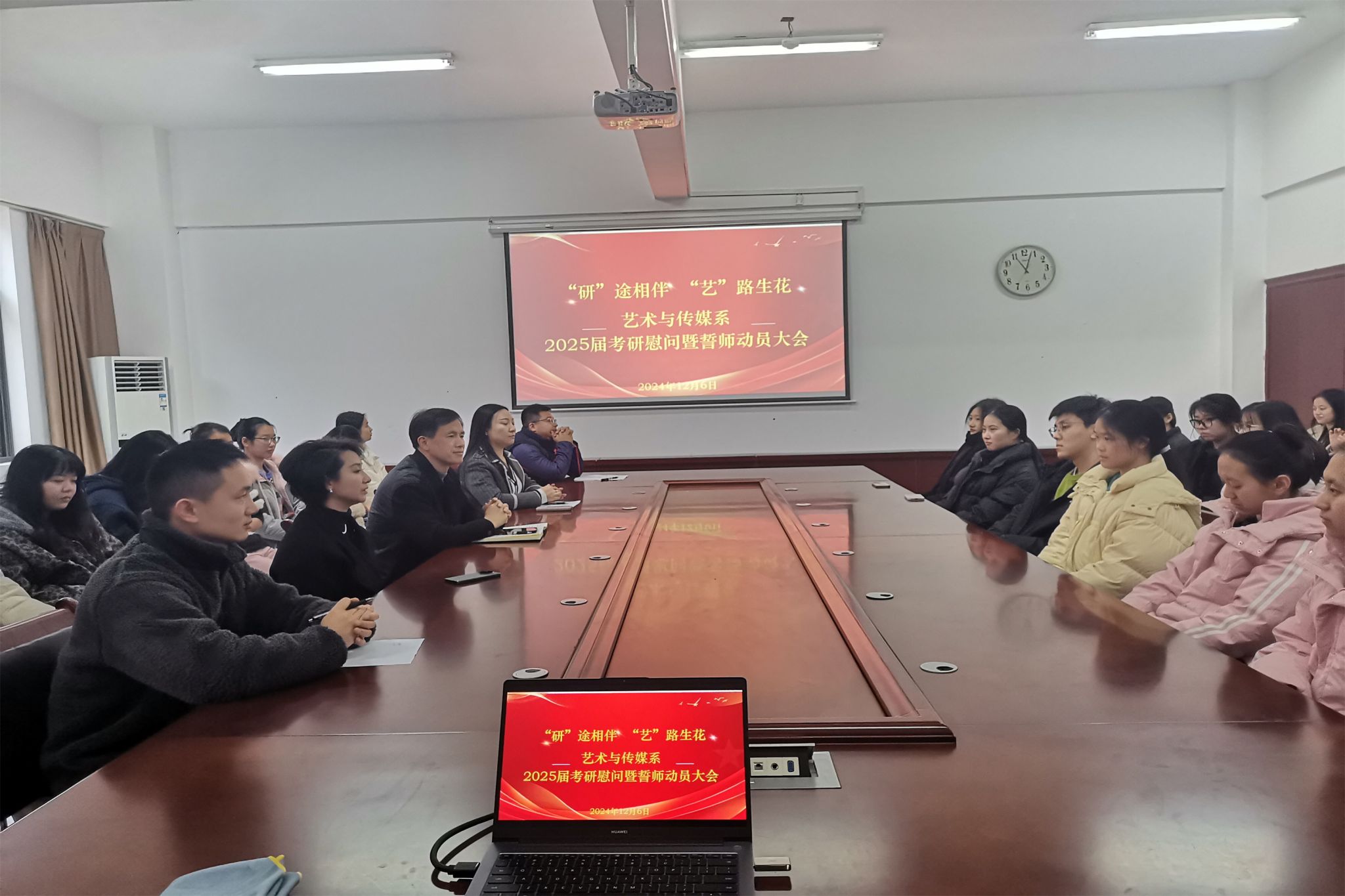 新闻网讯(通讯员赵鹏)2025年研究生招生考试在即,为鼓舞考研学子士气,坚定考研信心,缓解备考压力。12月6日上午,艺术与传媒系在艺术楼五楼会议室召开2025届考研慰问暨誓师动员大会。系党总支书记柯颂,党总支副书记、主任李洪波、副书记王林蓝以及全体2025届考研学生出席会议。会议由毕业班辅导员赵鹏主持。