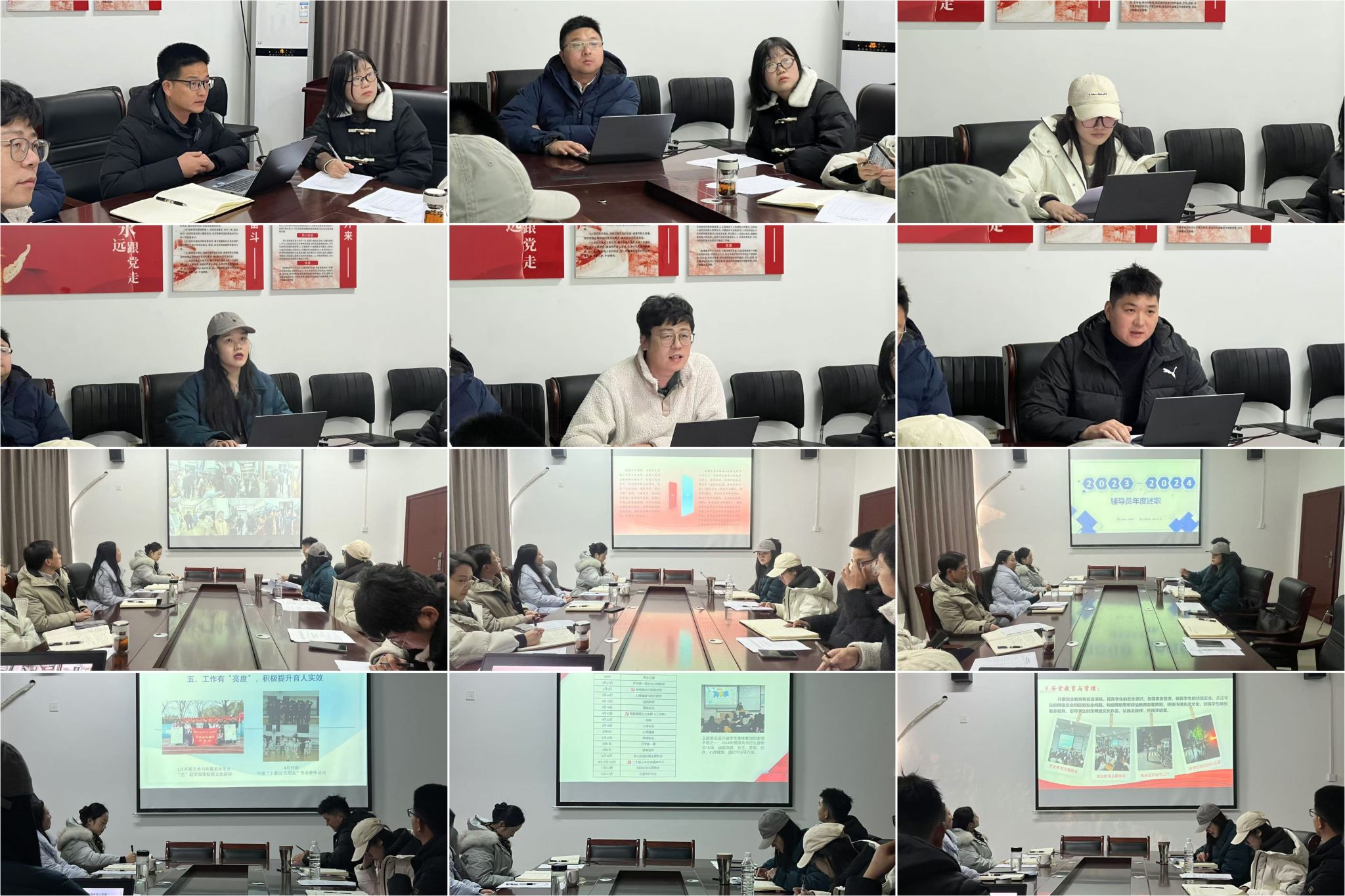 会上,每位辅导员围绕学生思想政治教育与班级日常事务管理、党团组织建设与心理健康教育、学风建设与学业指导、安全稳定等方面的具体工作进行了述职。他们通过详实的数据,全面总结了2023-2024学年度的个人工作实绩和育人成效,分享一年来的工作收获与感悟,坦诚地指出了工作中的不足,并明确了下一步努力的方向。