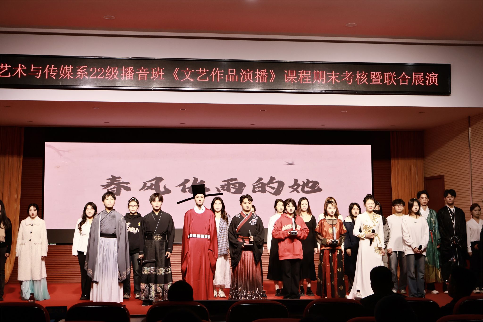 新闻网讯(通讯员黄艺丰)2024年12月30日,在岁末年初的温馨氛围中,艺术与传媒系新闻教研室在我校行政楼学术报告厅举办了2022级播音主持专业《文艺作品演播》课程的期末考核暨联合展演。