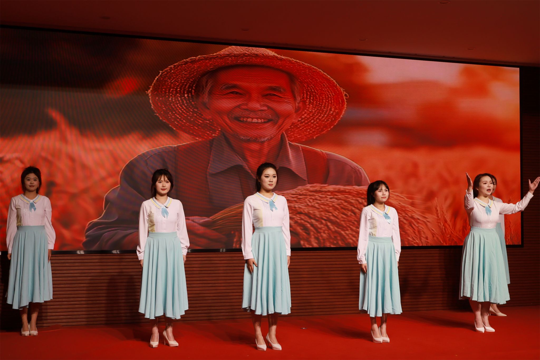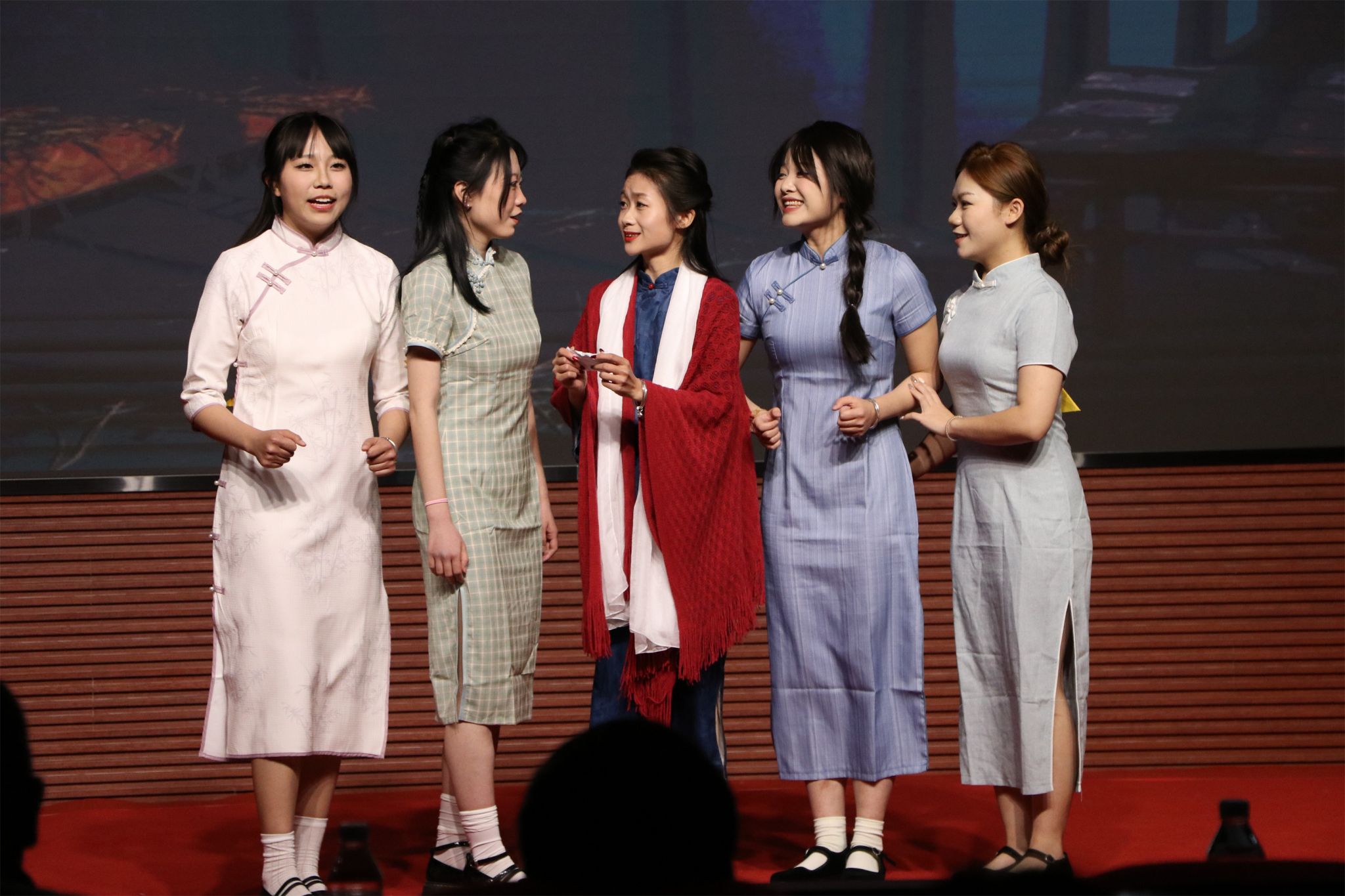 情境配音环节则是本次汇演的又一大亮点。学生们以“母亲”为主题,将古典诗词和影视配音贯穿起来,利用自己的声音魅力和专业技能,为观众现场呈现了“大耳朵图图”、哪吒、李焕英和张桂梅等角色形象。表演者的声音时而高亢激昂,时而低沉婉转,完美还原了角色的性格和情感,让观众仿佛置身于影片之中,身临其境地感受了故事的魅力。最后,整场演出在《青春的报告》中完美谢幕。