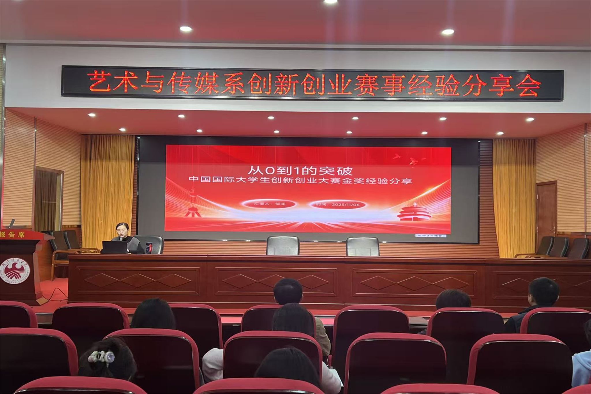 新闻网讯(通讯员潘俊峰)为提升师生创新创业能力,激发参赛热情,艺术与传媒系于11月7日,在行政楼五楼报告厅顺利举行创新创业赛事经验分享会。本次活动特邀新闻教研室邹澜老师作为主讲嘉宾,为广大师生带来一场内容丰富、实用性强的赛事指导讲座。艺术与传媒系党总支书记柯颂、系主任李洪波出席活动,与会师生代表三百余人共同参与。