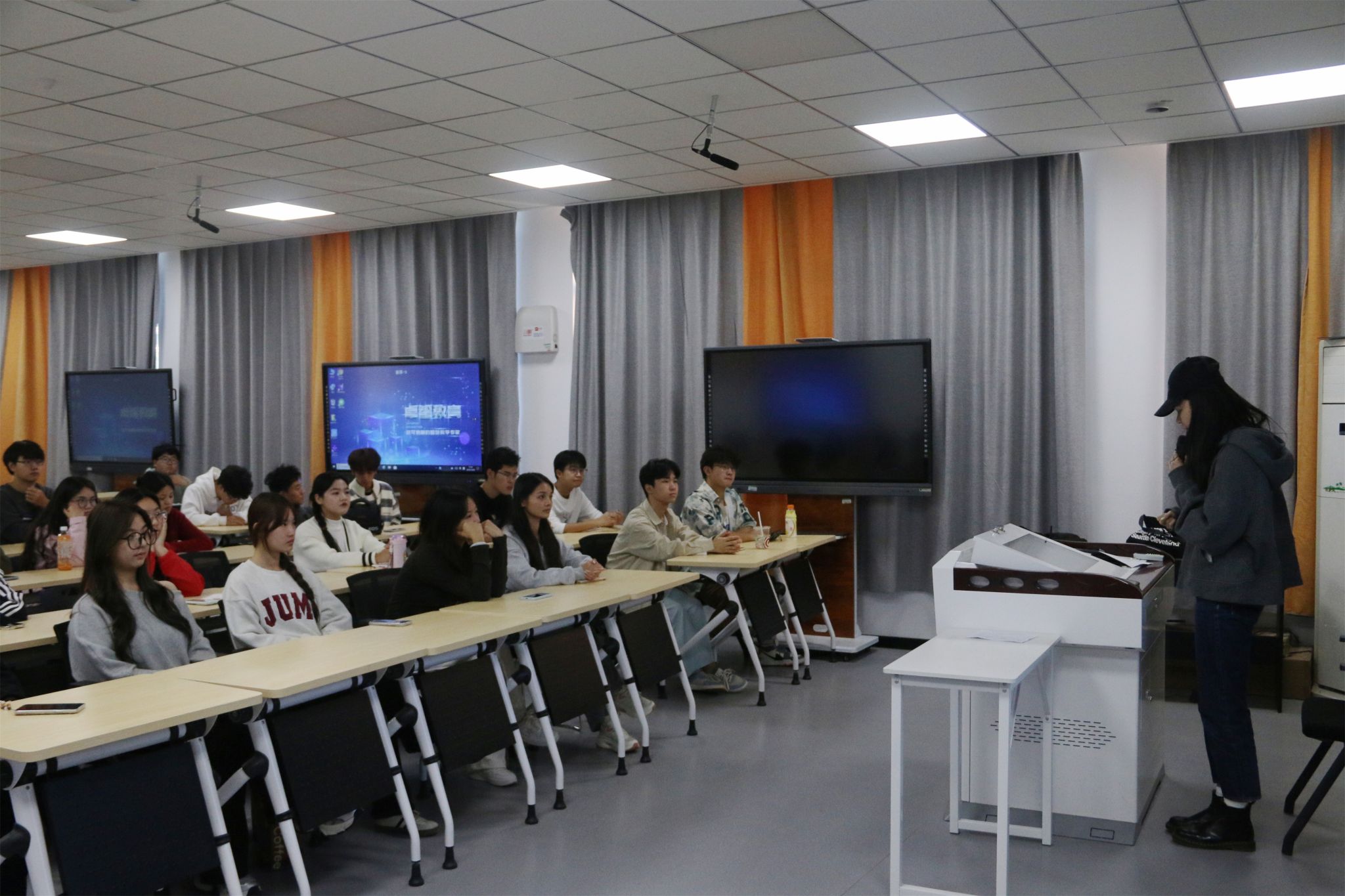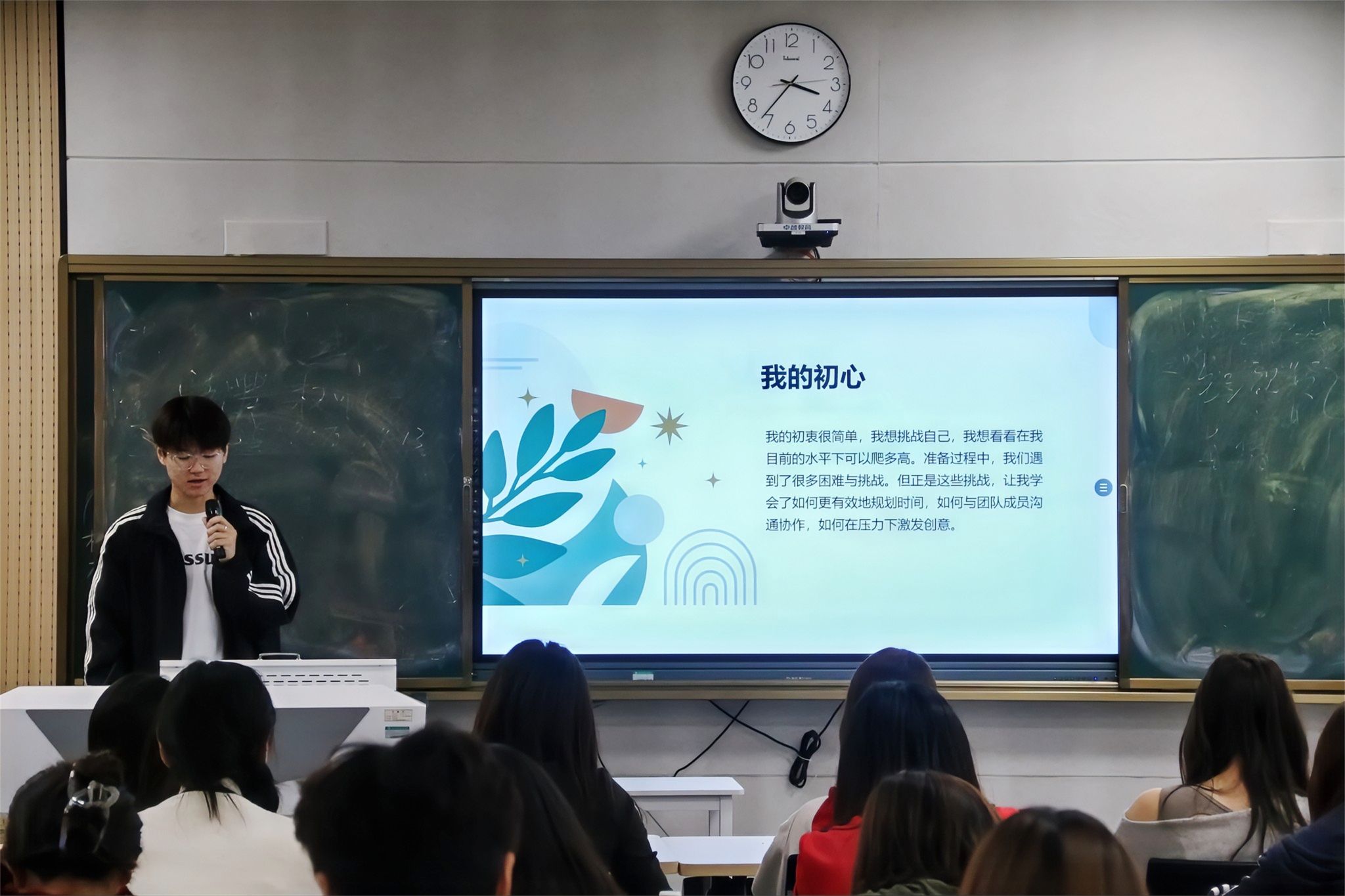 彭悦同学则结合自己专业与社会实践,分享了自己在2024第16届全国大学生广告艺术大赛的经历,他回忆了参赛过程中的点点滴滴,从创意的初心到作品的反复打磨,以及面对困难时团队合作的力量,并最后取得了突破性的好成绩,与此同时,鼓励同学们勇于尝试,保持思考,有着向上的信心,就能激发无限潜力。