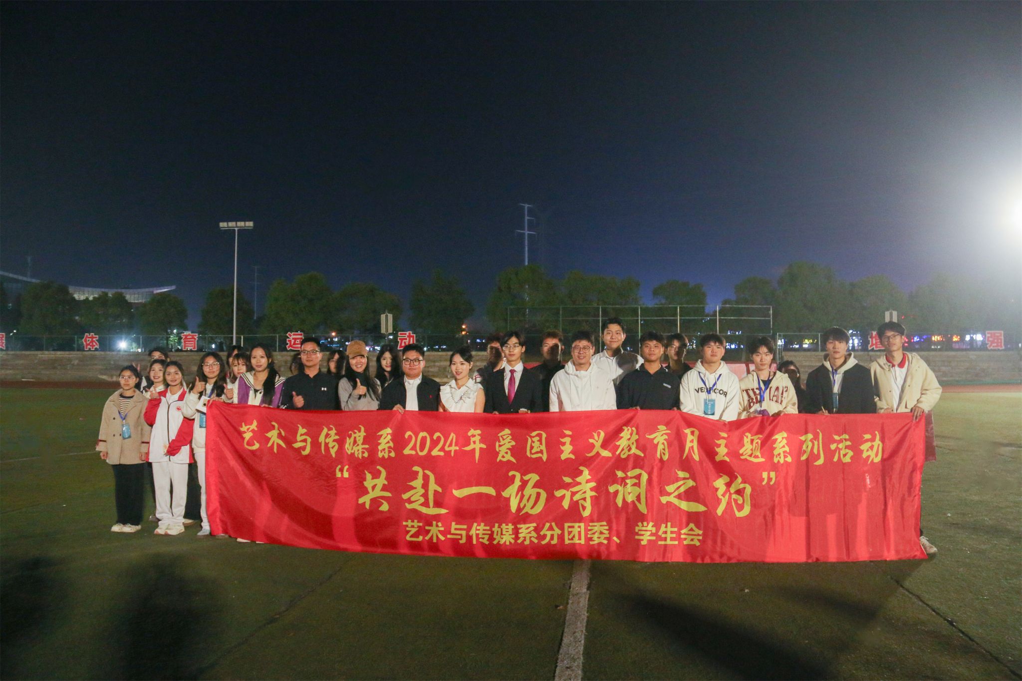 新闻网讯(通讯员权晨、方科)为大力弘扬爱国主义精神,厚植爱国情怀,加强对学生的思想与价值引领,凝聚青春力量,振奋精神风貌,11月10日晚,艺术与传媒系分团委学生会组织开展“共赴一场诗词之约”校园文化活动,旨在进一步激发我系青年的爱党爱国热情和民族自豪感,以诗歌朗诵彰显爱党爱国情怀,艺术与传媒系全体辅导员、近600名学生参加了此次活动。