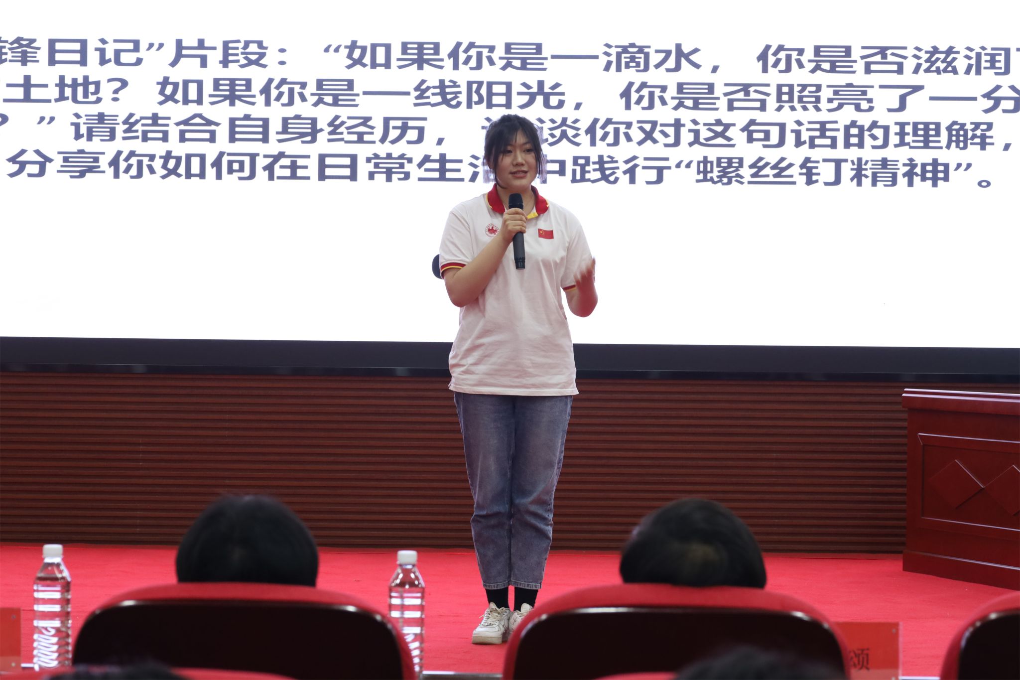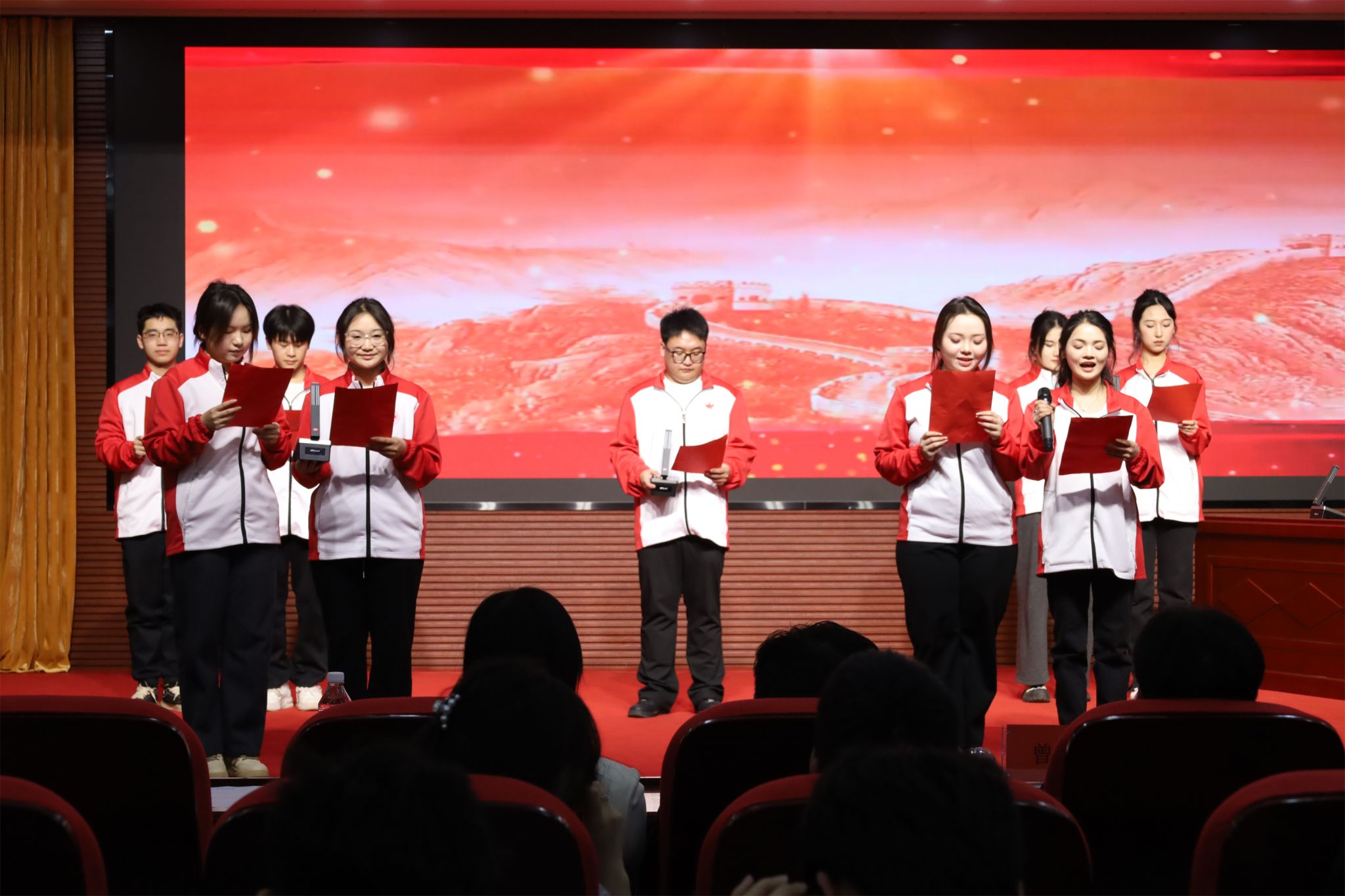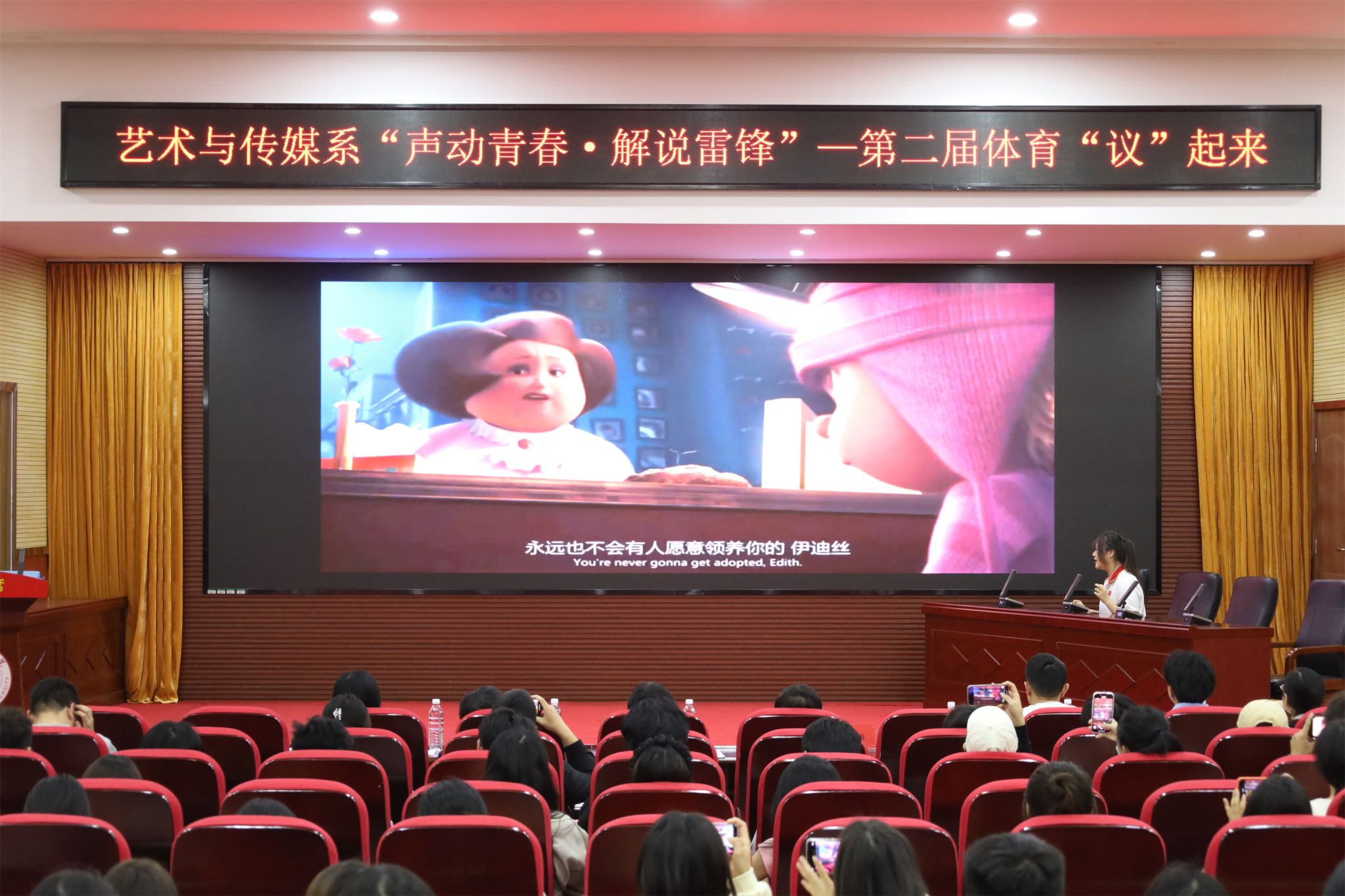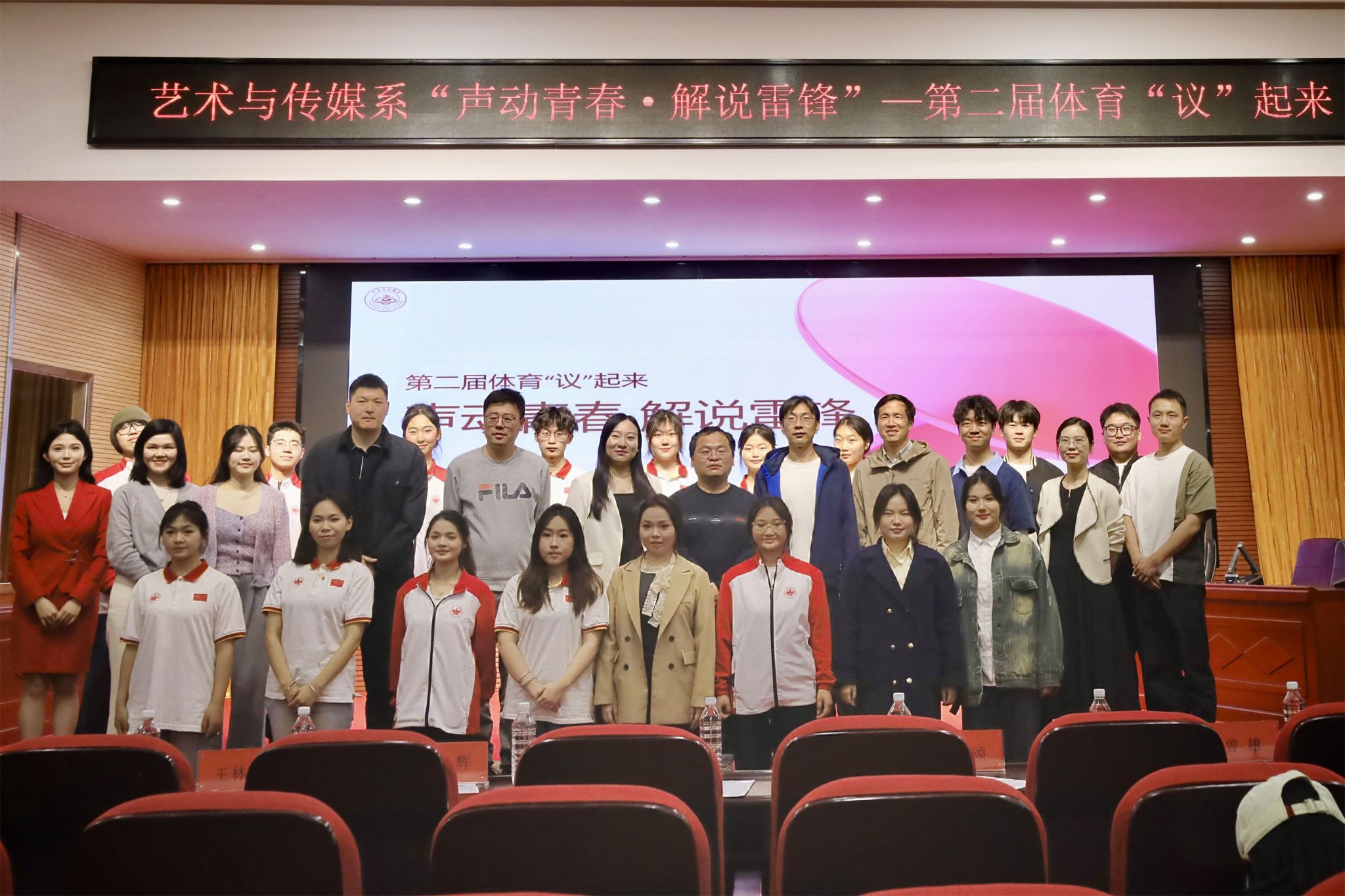 新闻网讯(通讯员 权晨、方科)为认真贯彻习近平总书记关于深入开展学雷锋活动的重要指示精神,以社会主义核心价值观为引领,践行我系艺术类学科专业特色,激励青年学子以实际行动践行新时代使命,3月25日晚,艺术与传媒系分团委学生会在行政楼五楼报告厅组织开展《“声动青春·解说雷锋”—第二届体育“议”起来》校园文化活动,旨在将体育赛事解说的拼搏精神、艺术表达的创新活力与雷锋精神的奉献底色深度融合。武汉体育学院体育科技学院财务处处长曾季、艺术与传媒系党总支书记柯颂、体育教育训练系党总支副书记杨辉、艺术与传媒系党总支副书记王林蓝,新闻教研室播音与主持专业教师黄艺丰、邹澜,全体辅导员和近220名学生参加了此次活动。