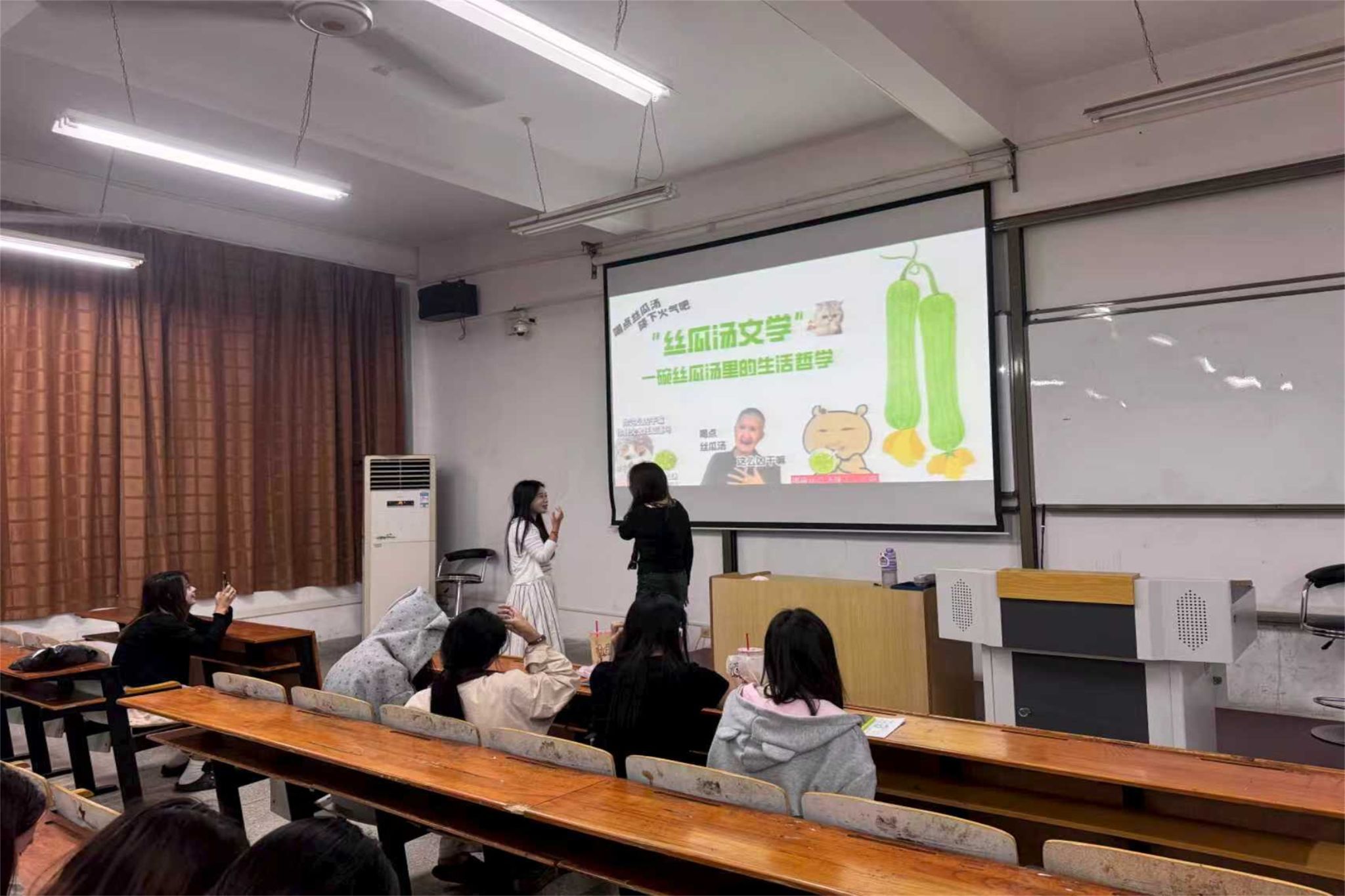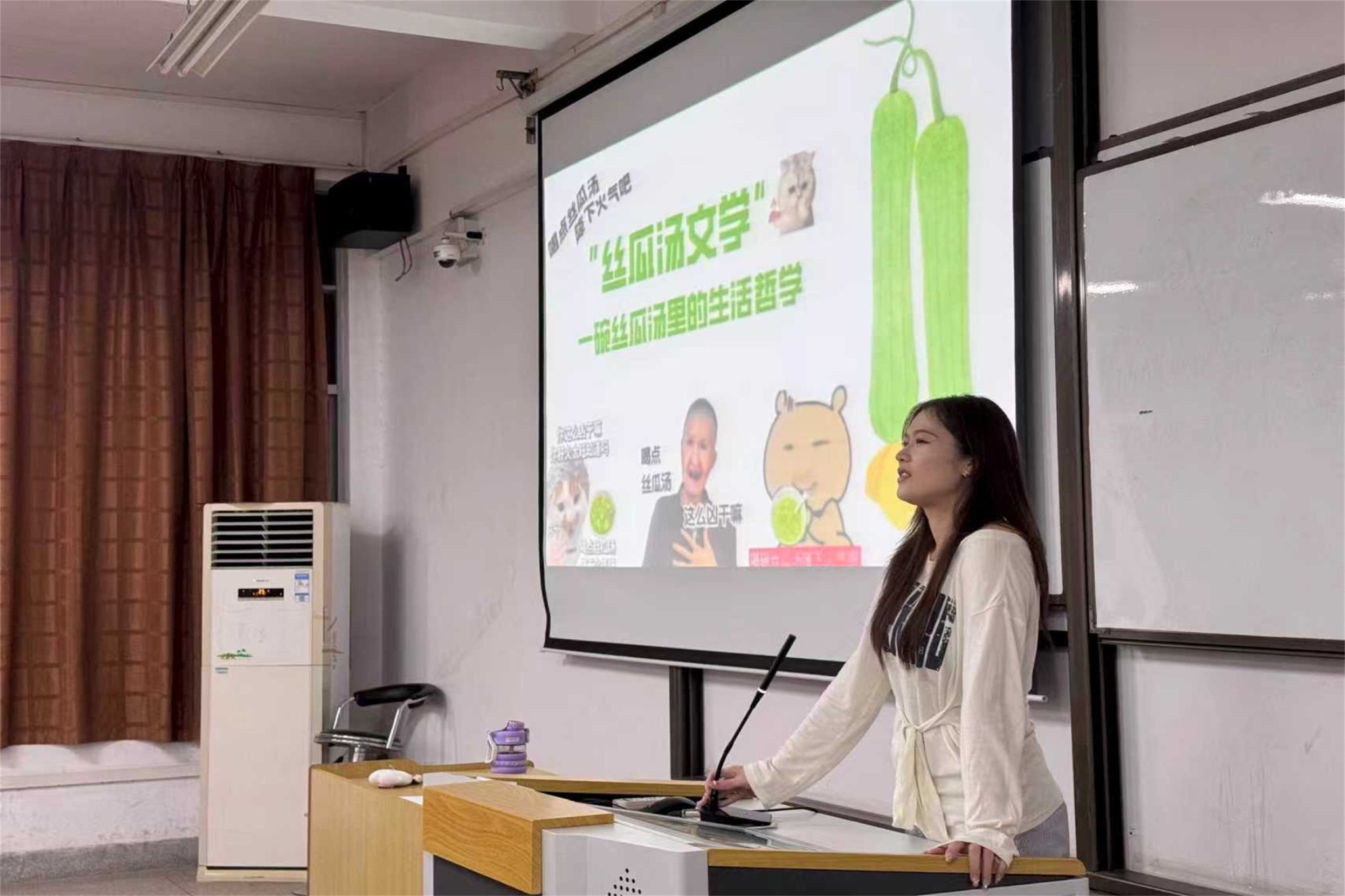 首位“开麦”的戴新瑞,聚焦抖音热梗“丝瓜汤文学”,从流行背景、情感内核与传播逻辑三方面展开剖析,将日常场景转化为观察社会情绪的文化切片。互动环节中,同学们即兴演绎,以情景剧再现“丝瓜汤”背后的生活百态,现场笑声与掌声不断。